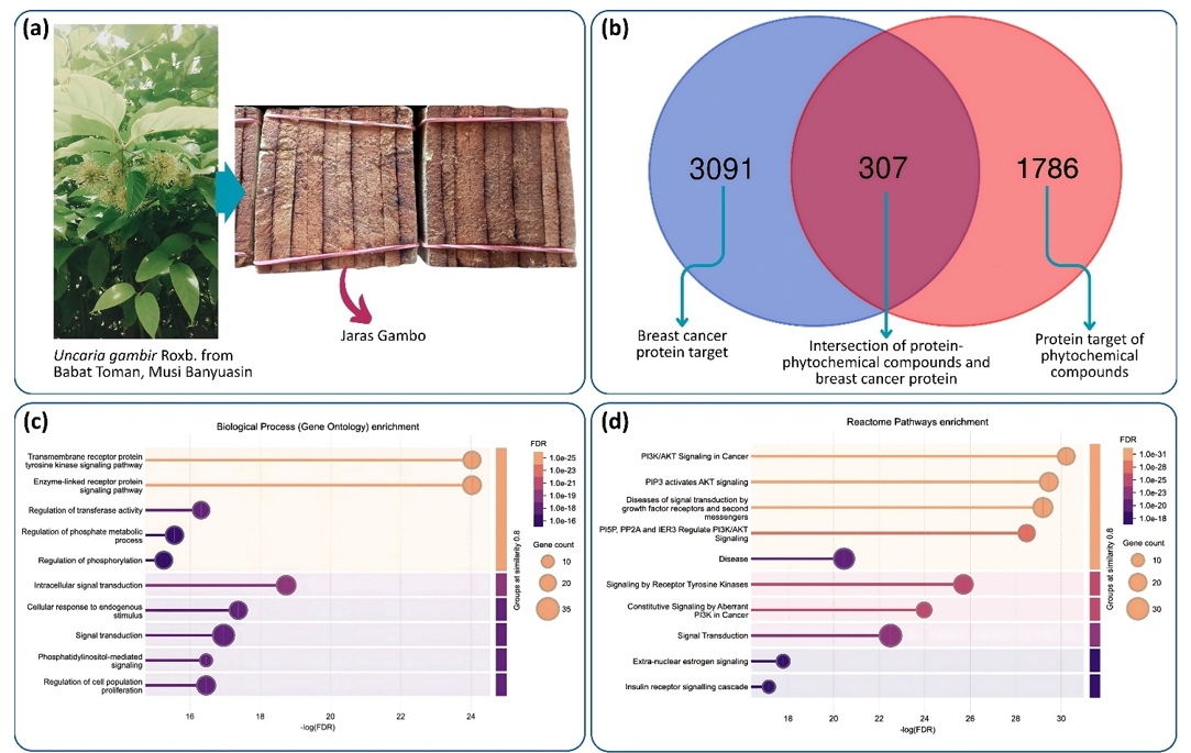 Methods: Jaras Gambo (processed gambier sap mass; Uncaria gambir Roxb.) collected in Babat Toman, South Sumatra, was macerated in ethanol, and the macerate was then filtered and concentrated to obtain a crude extract. Its constituents were profiled by liquid chromatography–high-resolution mass spectrometry (LC–HRMS). Network pharmacology (target prediction, pathway enrichment, and drug-likeness/toxicity screening) was integrated with structure-based molecular docking to prioritize active constituents and predict their interactions with breast cancer–related proteins.